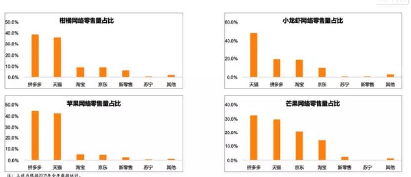 同時,在蘋果、柑橘、芒果品類的網(wǎng)絡零售量分布中,來自拼多多等新電商平臺的渠道占比分別達44.35%、38.6%、32.2%,均排名第一。在“網(wǎng)紅單品”小龍蝦品類中,傳統(tǒng)電商平臺仍占絕對優(yōu)勢,但新電商平臺消費增長迅速,渠道占比已躍居第二。