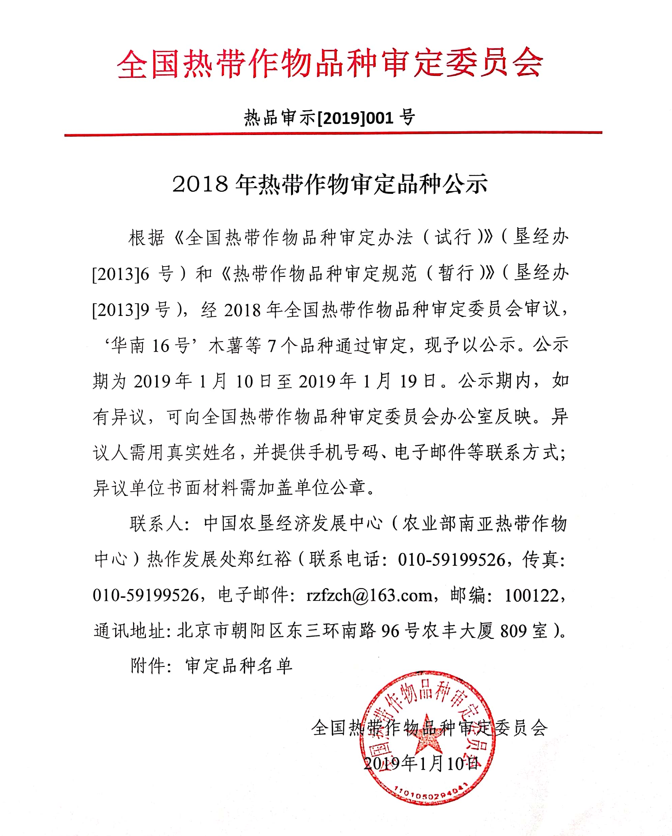 2018年熱帶作物審定品種公示