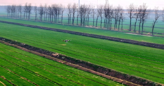 春雨綿綿潤(rùn)沃野,科技助農(nóng)正當(dāng)時(shí)。濕潤(rùn)的麥田上空,一架架植保無人機(jī)正按照設(shè)定路線穿梭作業(yè),上演著“速度與激情”?!把b肥、起飛、噴施,一氣呵成。一臺(tái)無人機(jī)每小時(shí)可施肥50畝,全天候連續(xù)作業(yè)可達(dá)千余畝。”六生產(chǎn)區(qū)負(fù)責(zé)人倪信軍說,在春雨墑情適宜的關(guān)鍵期,無人機(jī)作業(yè)不受田間路況影響,不僅效率倍增,還能有效避免傳統(tǒng)拖拉機(jī)進(jìn)田對(duì)小麥根系造成的損傷,真正實(shí)現(xiàn)精準(zhǔn)撒施、減肥增效。