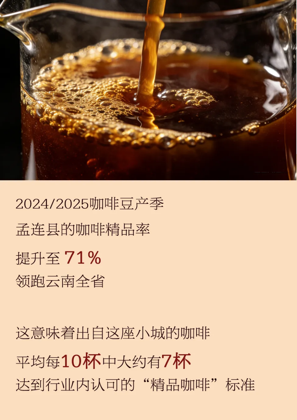 近年來,為實(shí)現(xiàn)從種子到杯子的全過程精品,孟連縣出臺了咖啡生豆及烘焙豆精品率雙提升三年行動(dòng)計(jì)劃,從種植端到加工端對精品咖啡生產(chǎn)進(jìn)行扶持。目前,孟連縣已建成精深加工生產(chǎn)線6條和鮮果集中處理中心16個(gè)。2024/2025年產(chǎn)季,全縣咖啡米產(chǎn)量1.23萬噸,精品咖啡產(chǎn)量0.87萬噸,咖啡精品率從40%提升至71%,咖啡精品率居全省第一。