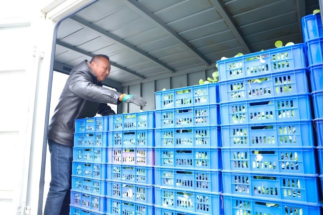 溫室內(nèi)暖意融融,一排排育苗穴盤整齊排列,嫩綠的白菜苗株型健碩、葉片舒展,在精細(xì)化管護(hù)下盡顯生機(jī)。工作人員們分工協(xié)作、忙而有序,熟練進(jìn)行拔苗、分揀、打包、裝車等作業(yè),動(dòng)作連貫高效,新鮮的白菜苗被整齊裝箱,即將運(yùn)往周邊種植基地,現(xiàn)場(chǎng)一派繁忙的出貨景象。