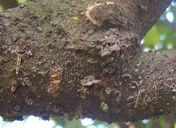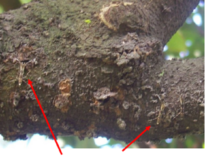 三、檢查藥效,及時(shí)進(jìn)行補(bǔ)藥噴殺。根據(jù)成蟲(chóng)白天棲于陰涼的樹(shù)冠內(nèi)膛枝桿上(如下右圖),受到驚嚇時(shí)會(huì)飛離枝桿這一特性,可每天清晨到果園進(jìn)行實(shí)地調(diào)查,對(duì)荔枝內(nèi)膛的枝桿進(jìn)行拍打(如下左圖),如發(fā)現(xiàn)還有成蟲(chóng)飛出,2天后再次噴藥。