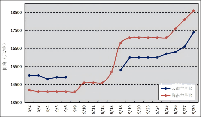 國內(nèi)主產(chǎn)區(qū):9月,海南、廣東部分產(chǎn)區(qū)受強(qiáng)臺風(fēng)侵襲,云南產(chǎn)區(qū)持續(xù)降雨,原料供應(yīng)緊張,帶動(dòng)收購價(jià)格大幅走高。云南產(chǎn)區(qū)因降雨未統(tǒng)計(jì)部分日期原料價(jià)格。云南、海南鮮膠乳(折干膠)月均價(jià)格分別為15743元/噸、15805元/噸,環(huán)比上漲1898元/噸、1991元/噸。