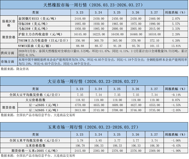 天然橡膠、大豆、玉米市場一周行情(2026.03.23-03.27)