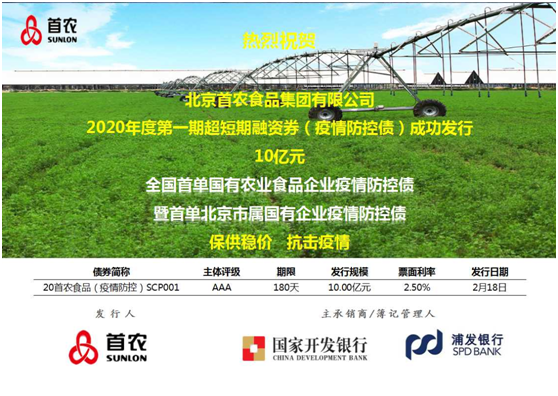 2月18日,2020年度北京首農(nóng)食品集團(tuán)有限公司(以下簡稱“首農(nóng)食品集團(tuán)”)第一期超短期融資券(疫情防控債)成功簿記發(fā)行。本次債券由國家開發(fā)銀行、上海浦東發(fā)展銀行聯(lián)合承銷,募集資金10億元,發(fā)行期限180天,發(fā)行利率2.5%,募集資金主要用于首農(nóng)食品集團(tuán)下屬北京二商肉類食品集團(tuán)有限公司疫情期間豬肉類產(chǎn)品的保障采購以及其他米、面、油、肉、蛋、奶、菜等食品的保障供應(yīng)。