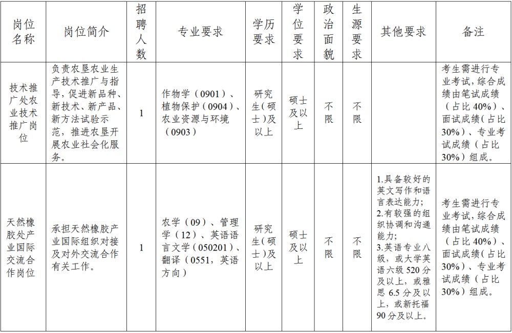 (三)應聘人員報名后,請及時查看個人的網上審核狀態(tài),并關注中國農業(yè)農村人才網站、中國農墾(熱作)網了解有關筆試、面試、專業(yè)能力測試及其他相關信息。同時,我中心將在面試前與進入面試的應聘人員進行電話確認,未進入面試的應聘人員不再另行通知。