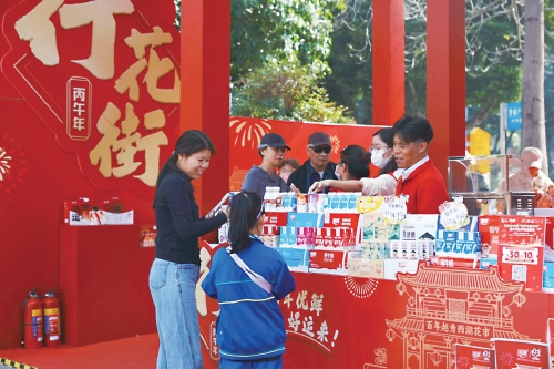廣東農(nóng)墾下屬燕塘乳業(yè)的展位上,工作人員忙碌著,將各類(lèi)奶產(chǎn)品交到消費(fèi)者手中。一旁的互動(dòng)墻上展示著燕塘乳業(yè)的故事、廣州花市的記憶和新春寄語(yǔ)。燕塘乳業(yè)的產(chǎn)品還換上了“馬年新衣”,包裝上印著花街門(mén)樓牌坊、節(jié)日焰火、聯(lián)名百年西湖花市非遺標(biāo)志,還有“掂過(guò)碌蔗”“家肥屋潤(rùn)”“撈乜都掂”“豬籠入水”等吉祥俚語(yǔ),讓奶產(chǎn)品成為承載年味的“文化名片”。市民購(gòu)買(mǎi)“新春限定版”牛奶,也將美好寓意一同納入行囊。